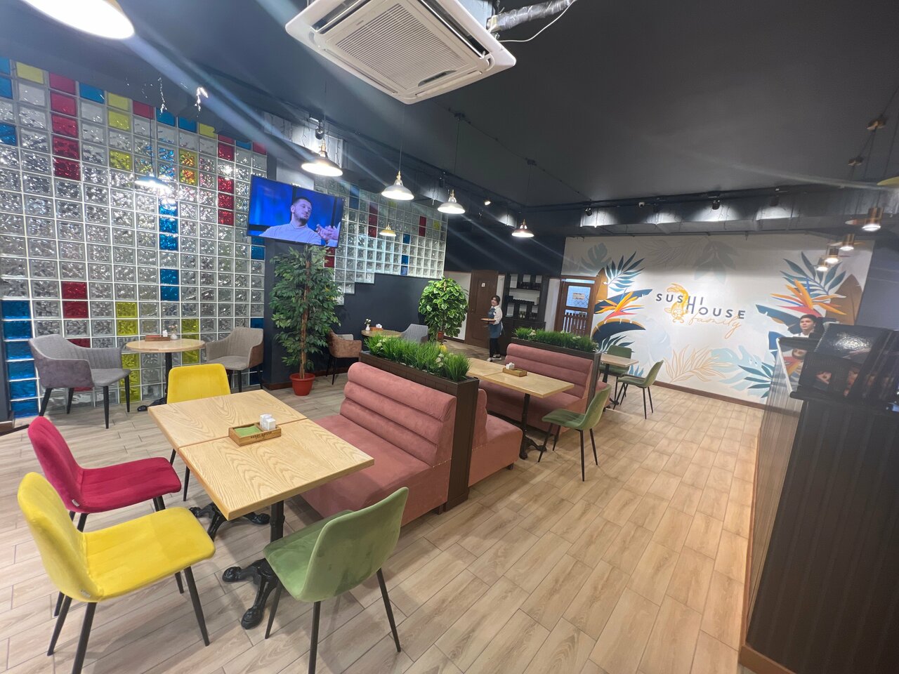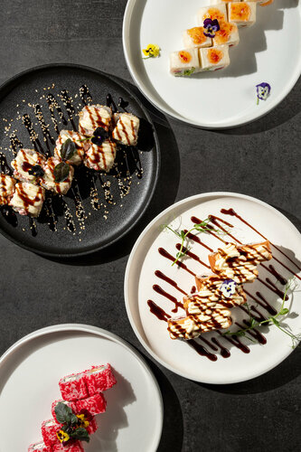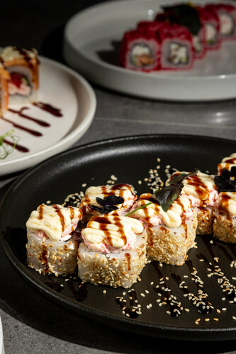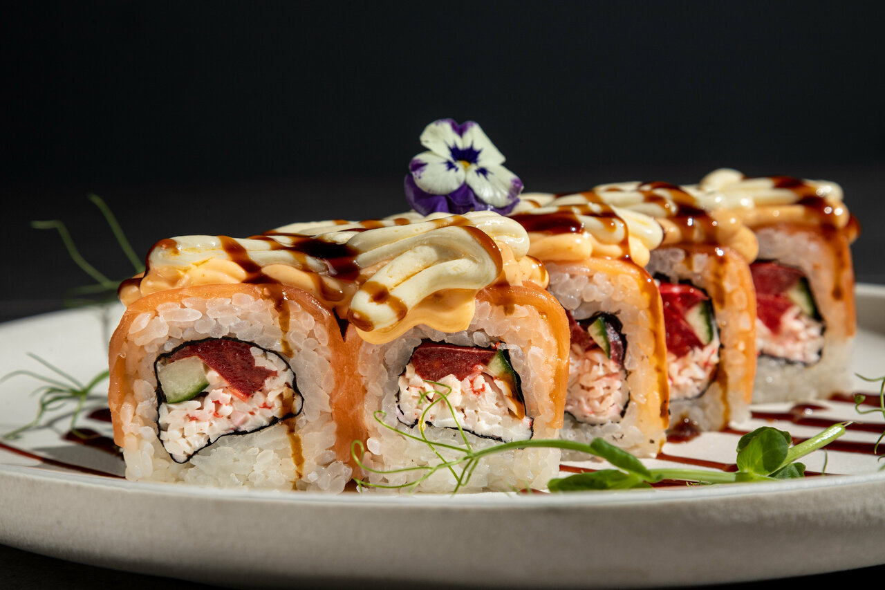 В формате залов и доставки мы предлагаем широкий ассортимент: суши, роллы, пиццу, горячие блюда и собственную выпечку. Наши преимущества – уютная атмосфера с детскими зонами, доступные цены, программы лояльности, халяльное меню без алкоголя, а также молельная комната.